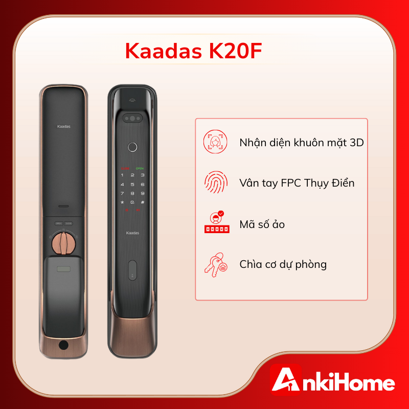 Kaadas K20F là dòng khóa cửa thông minh đa dạng màu bao gồm màu xám và đồng đỏ, thuộc phân khúc cao cấp, gây ấn tượng mạnh mẽ bởi sự kết hợp giữa thiết kế kéo đẩy (Push-Pull) hiện đại và công nghệ nhận diện khuôn mặt 3D tiên tiến. Đây được xem là giải pháp an ninh toàn diện, mang lại trải nghiệm mở cửa “không chạm” tiện lợi cho người dùng với 2 màu xám và đồng đỏ.