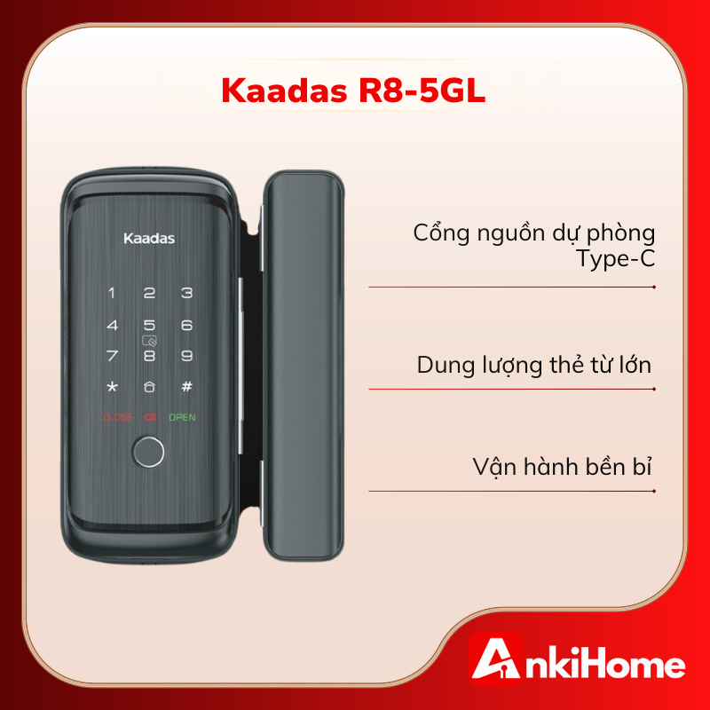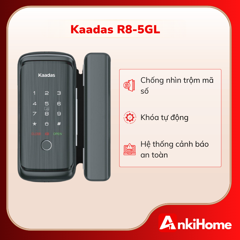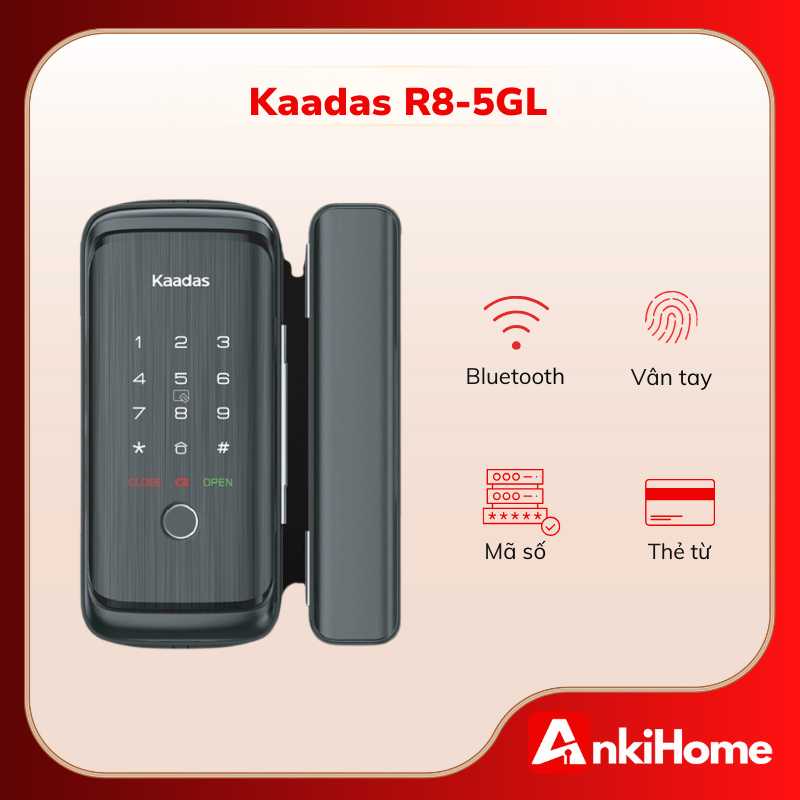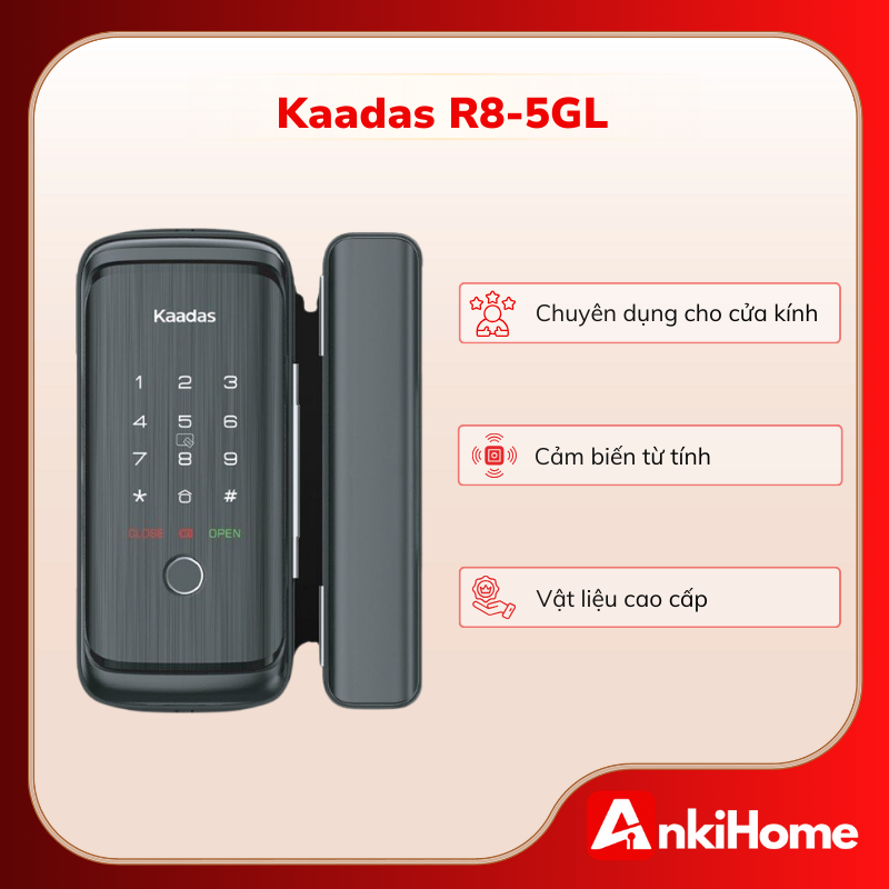 Kaadas R8-5GL sở hữu tông màu đen sang trọng, là dòng khóa thông minh chuyên dụng, được thiết kế riêng biệt để tương thích hoàn hảo với các hệ cửa kính (Glass Door). Với thiết kế hiện đại, nhỏ gọn và lắp đặt không cần khoan kính, sản phẩm mang lại sự sang trọng và bảo mật tối đa cho văn phòng hoặc nhà ở hiện đại.